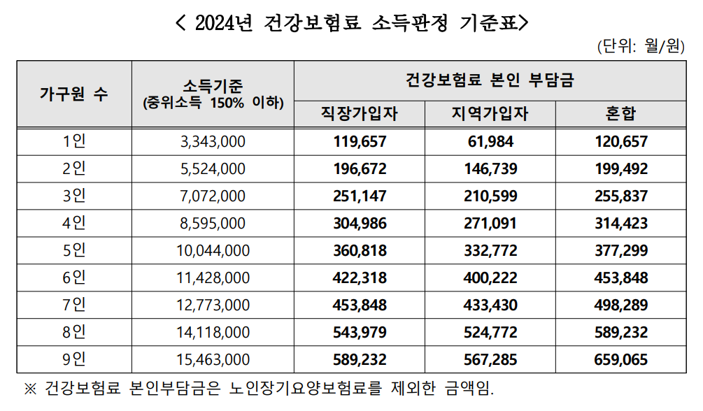 (신청인이 속한 가구의 건강보험료 '24년 7월 고지금액이 '24년 중위소득 150% 건강보험료 기준을 충족해야 함)