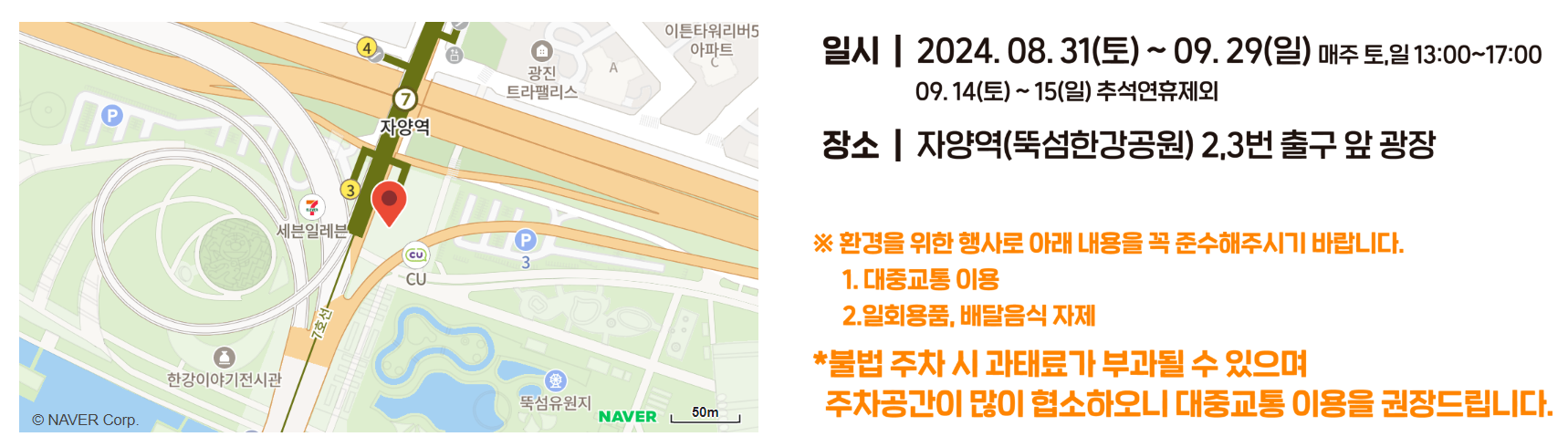 또한 서울숲 주차장도 행사장과 가까운 위치에 있어 이용하면 좋을것 같습니다.