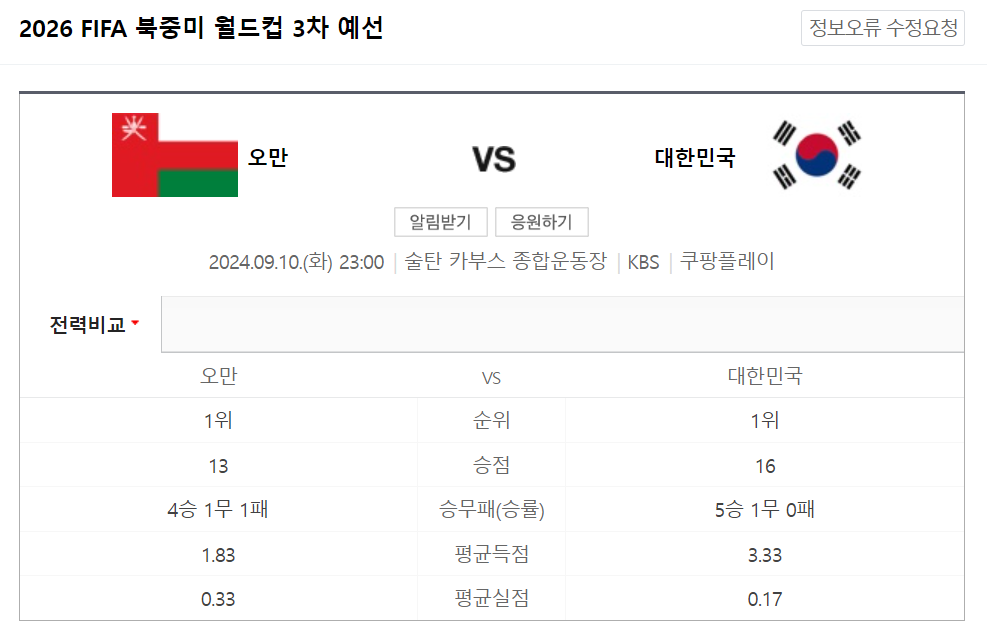 2024년 9월 10일 화요일 오후 11시 술탄 카부스 종합운동장에서 치뤄질 월드컵 예선전은